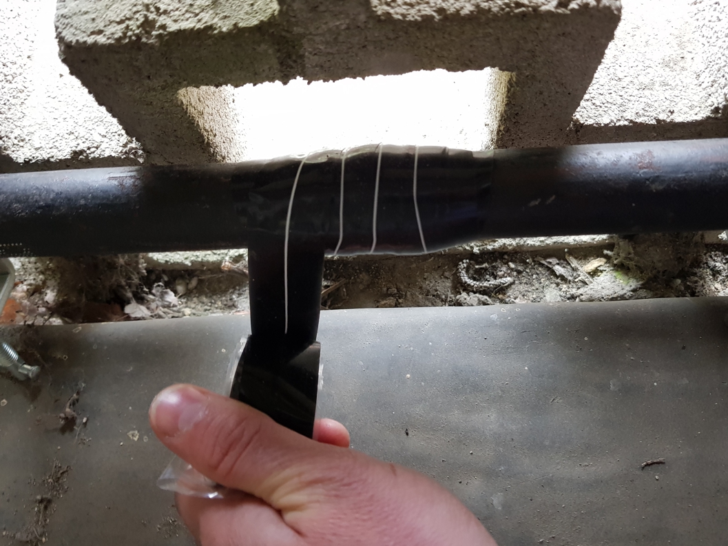 The tape was anchored 50mm to the right of the leak and held tightly against the pipe by the property owner carrying out the repair, using their thumb.