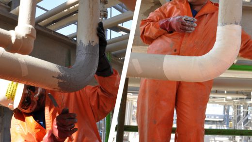 An elbow on a 100mm sulphuric acid pipeline which had degraded from 22mm thickness to just 1mm undergoes urgent reinforcement in a petrochemical refinery in Saudi Arabia
