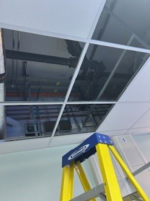 Damp patches were noticed in ceiling tiles above a busy corridor in the hospital. A maintenance worker climbed up a ladder, removed the tiles and accessed the roof space above to investigate.