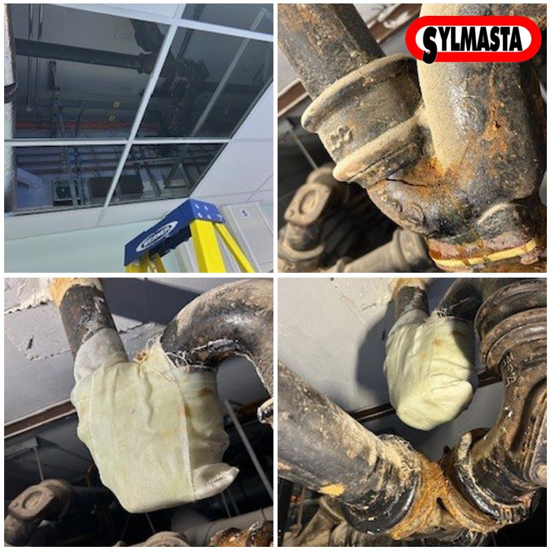 From the top of a ladder, a hospital maintenance worker makes a repair in under 15 minutes to a crack across a cast iron waste pipe U-bend. The pipe was part of a complex network inside a confined roof space above a corridor, making accessing the leak area difficult and replacing the U-bend impossible without dismantling the entire system.