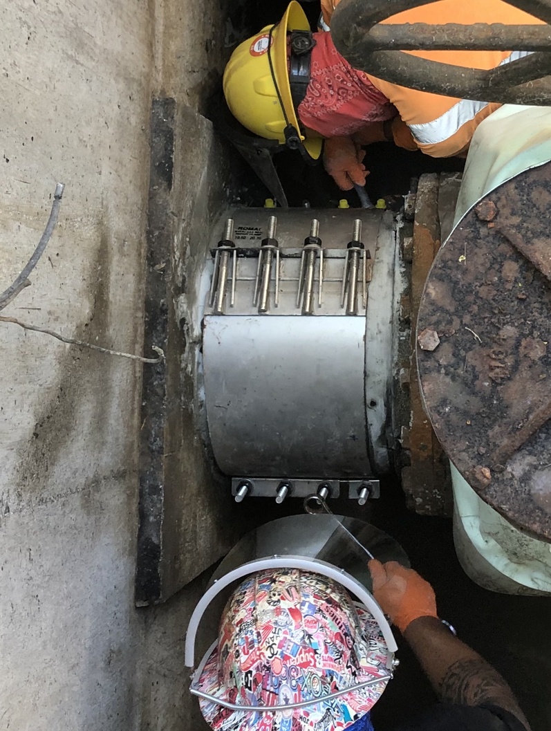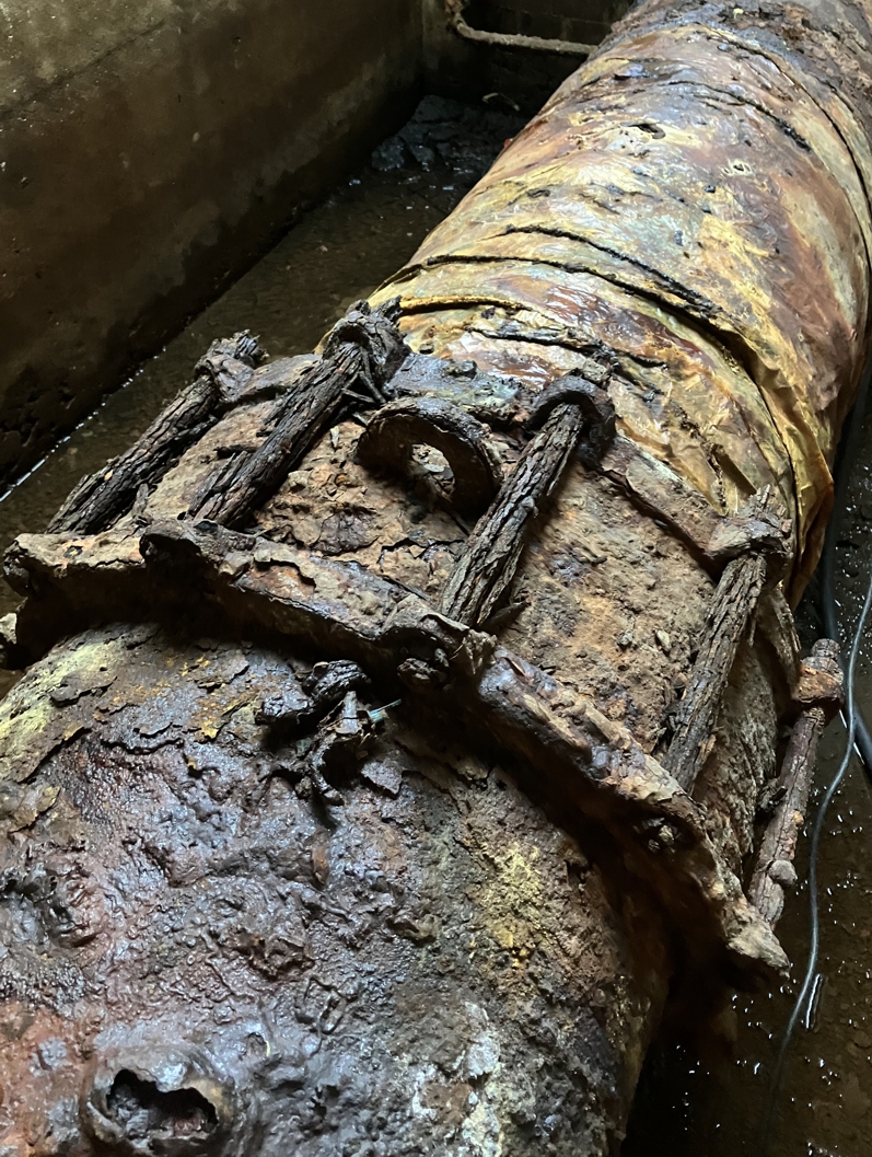 To seal the leak in the pipe, the contractors ordered a pipe repair clamp specifically fabricated for the line. But because the surface was so badly deformed by corrosion, it was impossible for the clamp to achieve a watertight seal. There were also concerns that tightening the clamp fully would further breach the brittle metalwork.