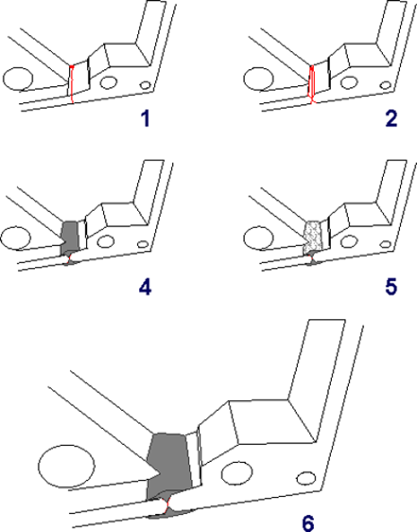 A coarse 3-square file was used to cut a V-shaped groove along the length of the crack, widening the gap in both the top of the metalwork and underneath. This increased the available surface area to which Industrial Metal could bond. The V-grooves were then degreased to remove contamination.
