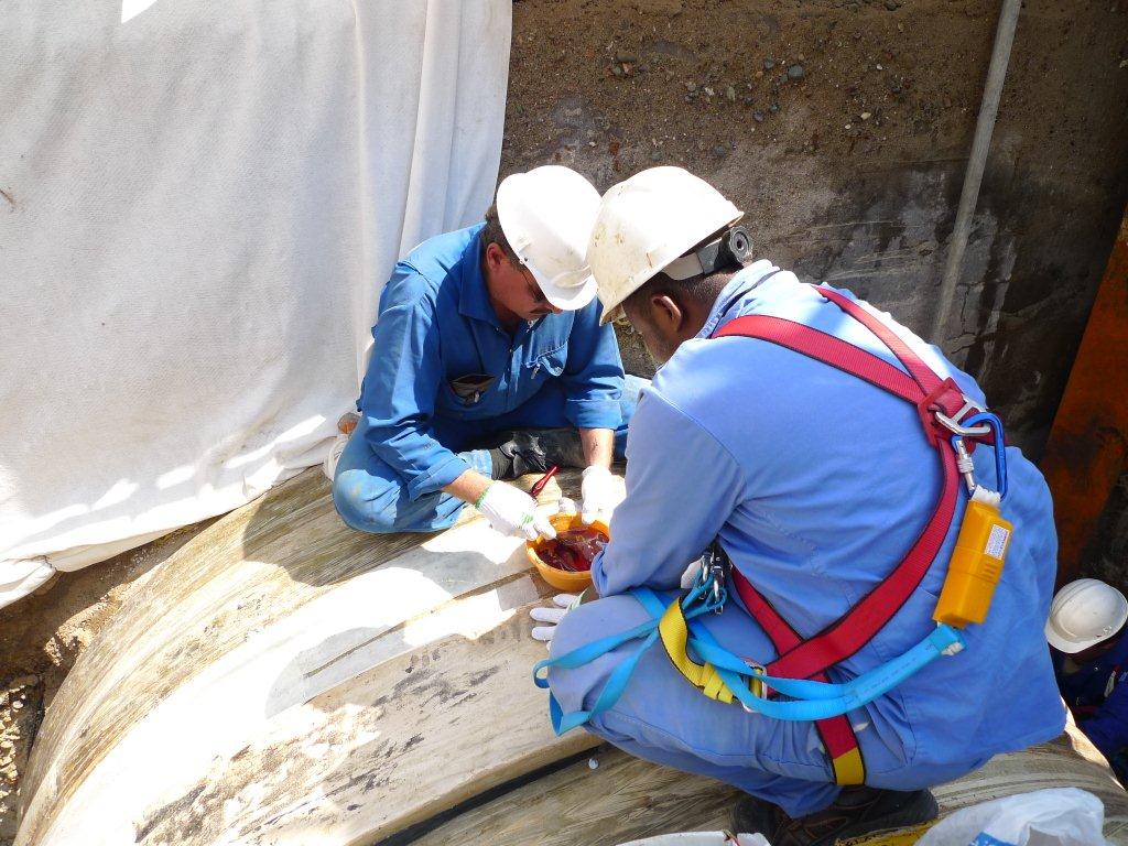 Problems during the installation of a three metre diameter FRP discharge pipe at a desalination plant in Saudi Arabia had caused gaps to appear between connecting rings on the line, which had to be sealed in a repair carried out whilst the pipe remained partially buried.