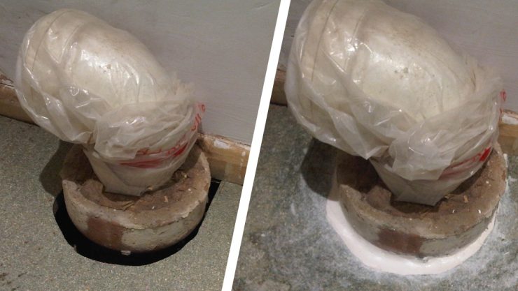 Once the putty had turned an off-white colour to indicate successful mixing, it was pushed into the gapping between the waste pipe and the floor whilst it remained soft enough to shape and manipulate.