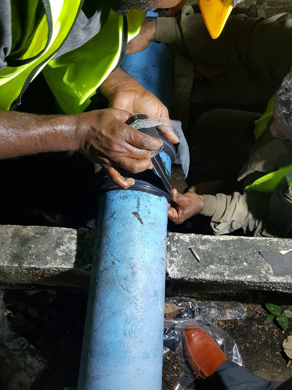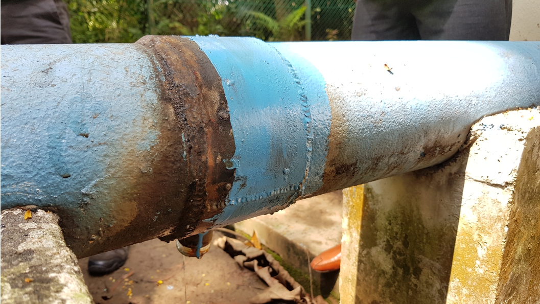 Several repair attempts had been made using different methods by the water company operating the facility, including the use of a clamp and epoxy putty, but none had been successful. The pipe had therefore been left to leak.