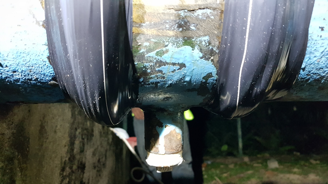 The 150mm steel pipe ran water out of the pumping house. The saddle joint had been welded in place to reinforce a capped tee and sat approximately 20mm higher than the original line. One end of the joint was suffering from heavy corrosion.
