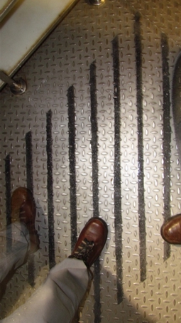 Masking tape was used to mark out where the anti slip strips were required. The surface was then painted with Liquid Metal, silicon carbide was sprinkled over the epoxy coating, and the masking tape removed.
