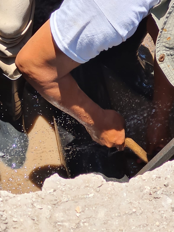 A bucket was used to remove enough water from the hole to enable the repair to take place. Wrap & Seal Pipe Burst Tape was used to seal the leak in the line, with several Tapes applied to cover the entire length of the split in the steel.