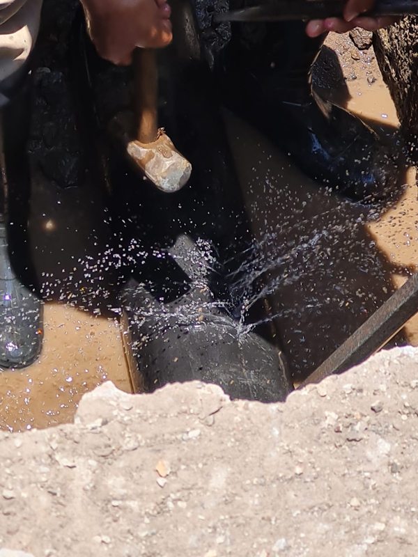 By the time the cement coating had been fully removed from around the leak area, enough water had escaped into the excavation hole to half-submerge the pipe. There was no means of isolating this section of the network and so the only option was to make a live leak repair.