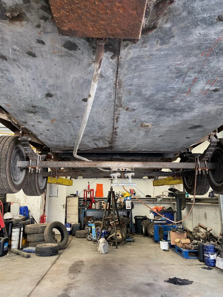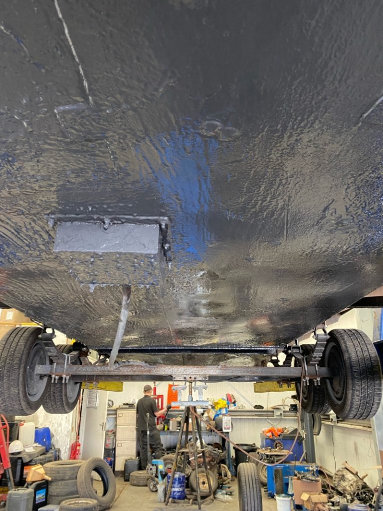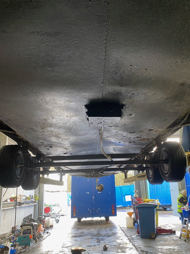 Sylmasta recommended a two-stage repair, starting with Sylmasta AB Original Epoxy Putty and finished with Liquid Metal Epoxy Coating. The first trailer was jacked up, enabling access underneath the wastewater holding tank. The metalwork was then ground down to remove rust, dirt and grime.