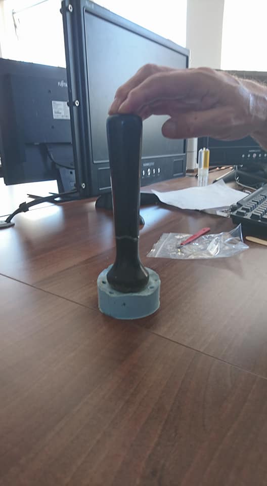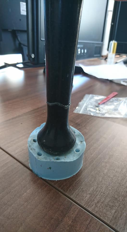The bottom section of the pestle meanwhile had been placed on a piece of rubber for support and to keep it upright. The top part was pushed firmly against the bottom section as soon as the adhesive had been applied. Excess epoxy squeezed out from between the joint was wiped away with a tissue.