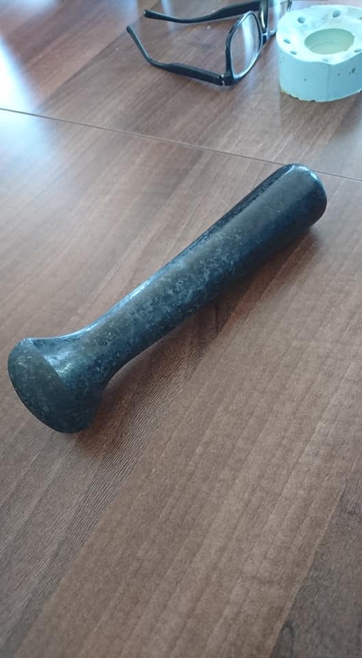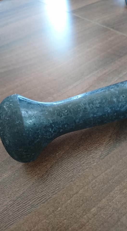 The mortar and pestle set was made of granite. The pestle had been cracked in two parts when it was dropped onto a granite kitchen worktop, leaving a break close to the base of the tool.