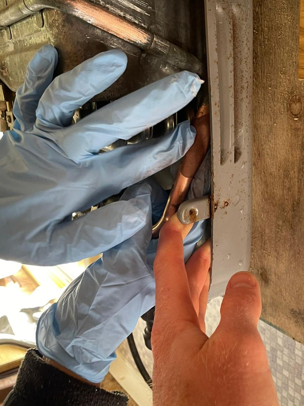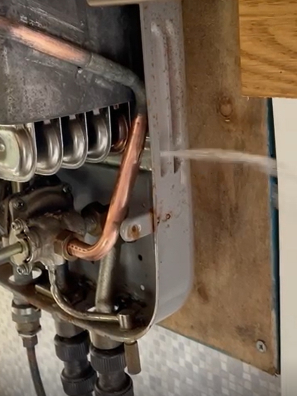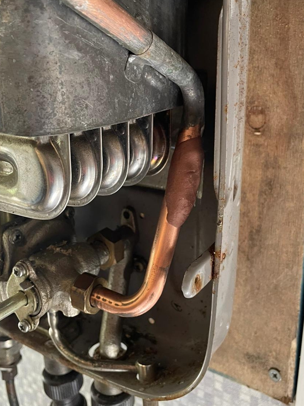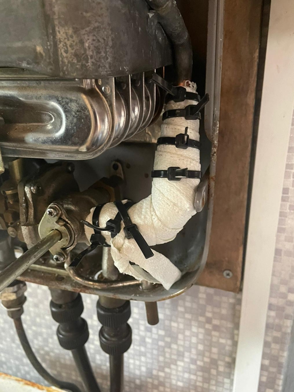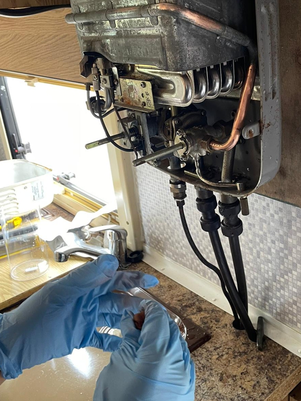 The boiler system provided heat and hot water to the camper van. A deep crack appeared in a copper pipe located underneath the cover of the boiler, causing a pressurised jet of water to spray out whenever the boiler was turned on.