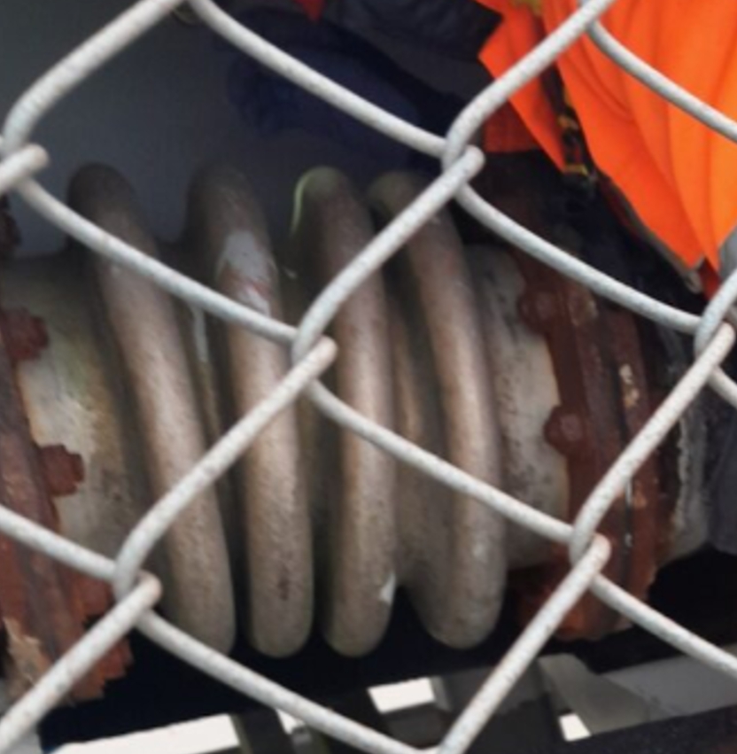They discovered a split in the expansion joint between two bellows, through which water was now flowing out. Comparing the position of the fitting from its previous mandatory safety inspection revealed it had moved and contracted significantly.