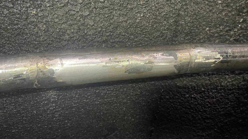 A leaking stainless steel heating pipe inside a biodigester tank at a pig farm undergoes successful repair after being breached in a collision with a metal pillar connected to a propeller mixing blade. This was the second repair attempt made by the farm after patch welding failed to seal the leak.