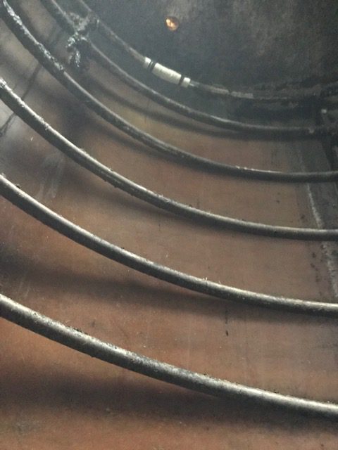 Multiple stainless steel pipes were located around the inside of the heating tank. It was one of these towards the very top which had become damaged when small pieces of farmyard debris had inadvertently been mixed in with the feedstock and dropped into the tank from the inlet above.