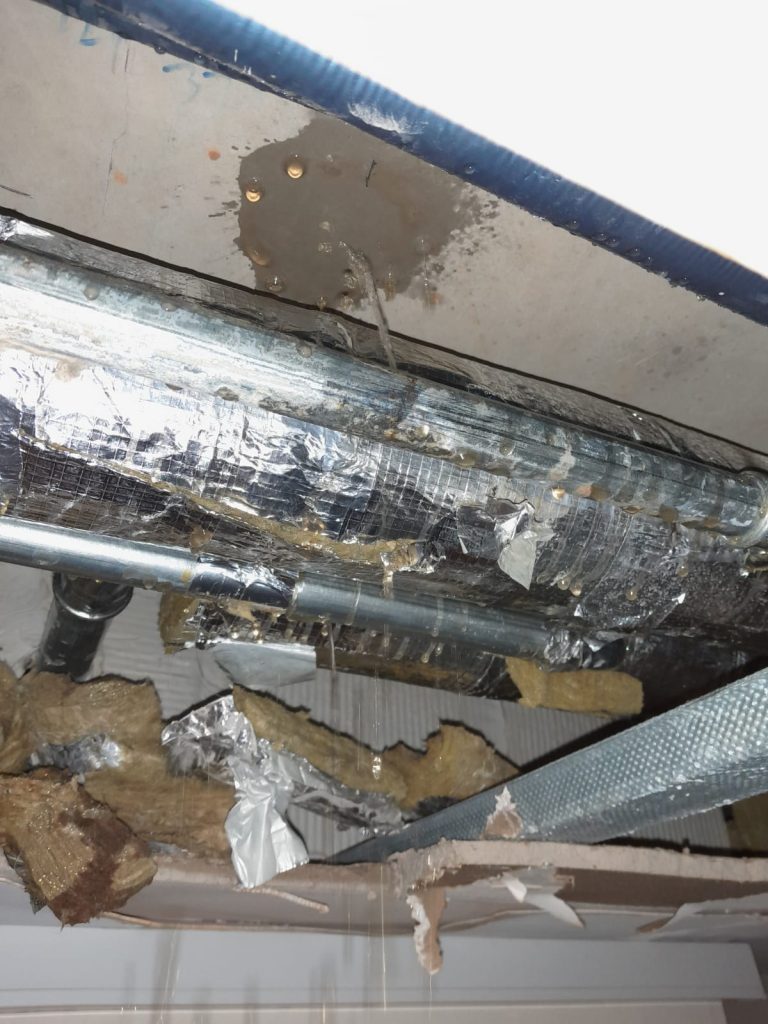 Flow could not be turned off, as this would have involved shutting down heating across the entire building. A live leak repair to the district heating system was therefore necessary, using lightweight materials which could be easily carried and applied from the top of a ladder used to reach the ceiling.