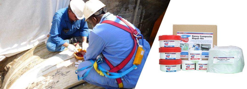 Kit containing Sylmasta E190 Brushable Epoxy Resin and Fibreglass Tape, enabling more versatile patch repairs to complex sections of pipework or tanks where direct bandage wrapping is not possible.